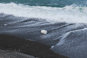 食見海水浴場の砂浜では発泡スチロールのブイが打ち上げられているのが目に入りました。