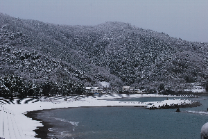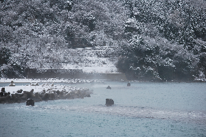 黒崎半島の山々は雪化粧をしてとても美しい景色をつくりだしています。小規模ながら、気温と海水温の差が大きい時に見られる蒸気霧も発生しており幻想的な風景を見る事ができます。