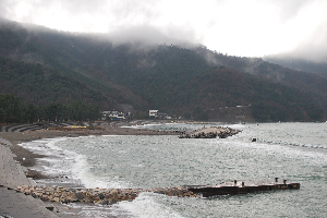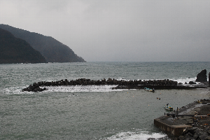 2015年1月17日9時現在は、雨で北西の風が吹き、食見海岸は防波堤を越える大きな波(2mほど)が時々来ます。