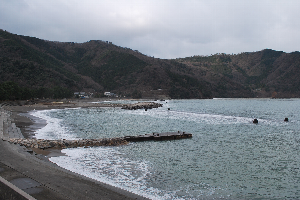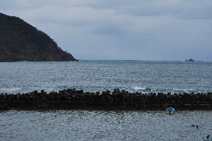 前日よりも海は穏やかになりつつあり、防波堤を越える大きな波はほとんどありませんが、岩場は波が砕け白い泡になって濁って見えます。