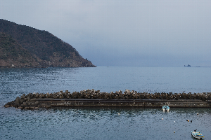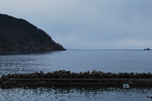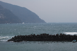 食見海岸は、時折防波堤の消波ブロックを越えるうねりがあり、荒れ模様です。