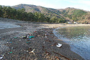 食見海岸は波もなく凪いでいますが、前日の波風によって食見海水浴場の砂浜には大量の漂着物が流れついています。漂着物には人工物だけでなく海の生き物も流れ着くことがあります。今日は天気も良く絶好の浜歩き日和です。皆さんも近くの浜を歩いてみてはいかがでしょうか。