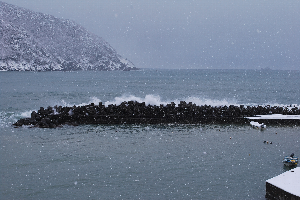 食見海岸は、強い北西の風が吹き、防波堤の消波ブロックを軽々と越えるような大波が数多く押し寄せています。