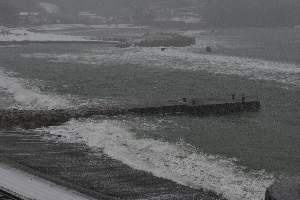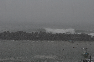 食見海岸の沖合には、白波が幾つも確認でき、防波堤にも大きなうねりが押し寄せています。