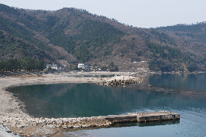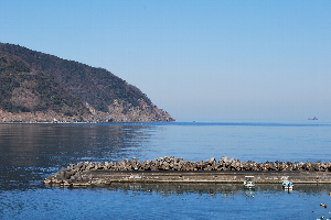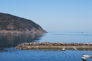 食見海岸は、べた凪で水面がまるで鏡のようになっています。