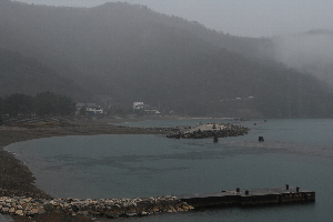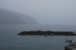 食見海岸は、昨日に続いて波もなくとても穏やかです。しかし、雨靄がかかっているため千島の影すら確認することができませんでした。