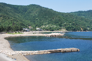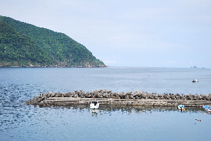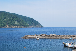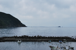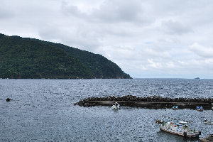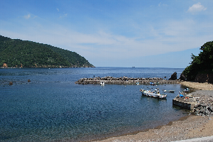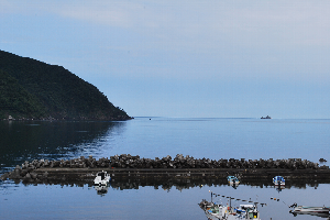 食見海岸は、波が無く穏やかな海況です。船が停泊していて、学校が魚釣り体験をしていました。