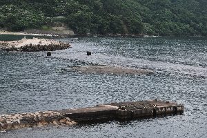 食見海岸では、0.5mほどの波が打ち寄せています。また、潜堤の手前には、流れ藻がまるで絨毯のように広がっています。