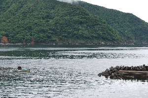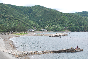 食見海岸は、波が無く穏やかな海況で、沖合いには手漕ぎボートで釣りをしている人たちが見られました。透明度は底の岩まではっきりと見える状態です。