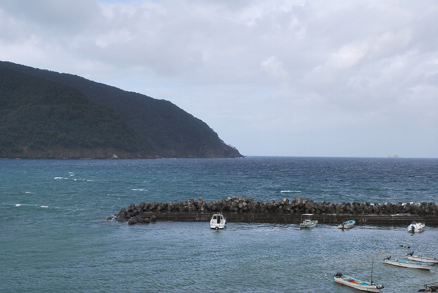 食見海岸は、大荒れで、1.5~2mほどの波があり、沖合には多くの白波が立っています。