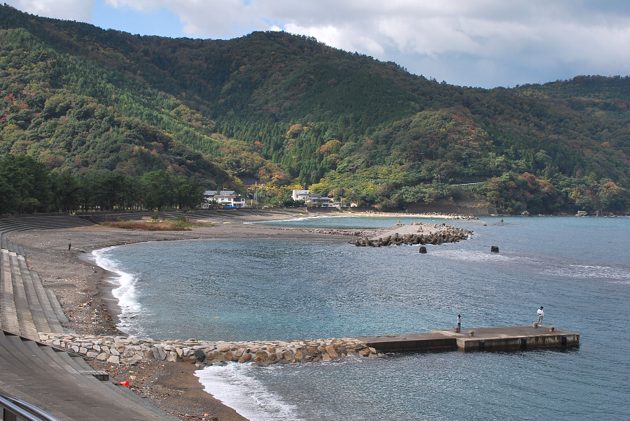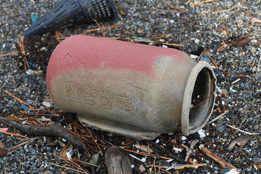 食見海岸は、0.5mほどのうねりがあり、多くの漂流物が浜辺に漂着していました。漂着物の中には韓国から流れてきたと思われるタコツボなどの漁具が多く見られました。