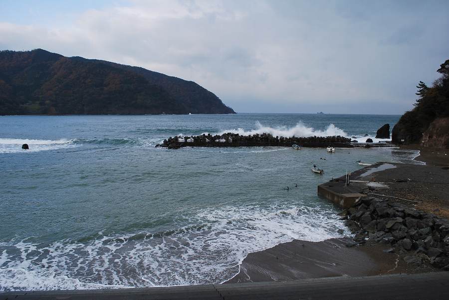 食見海岸は、時おり4mほどの波が来ており、防波堤に大波が当たると「ドドオォー!」と海鳴りが聞こえます。