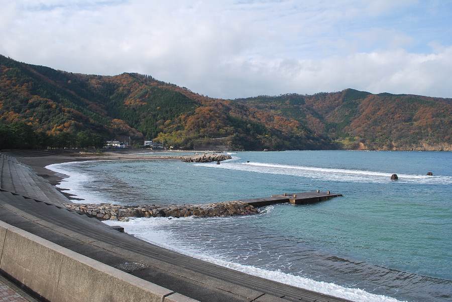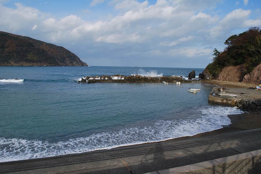 食見海岸は、昨日と同じく1~2mほどのうねりがあり、時おり消波ブロックを越えるような3mほどの高い波が来ることもあります。