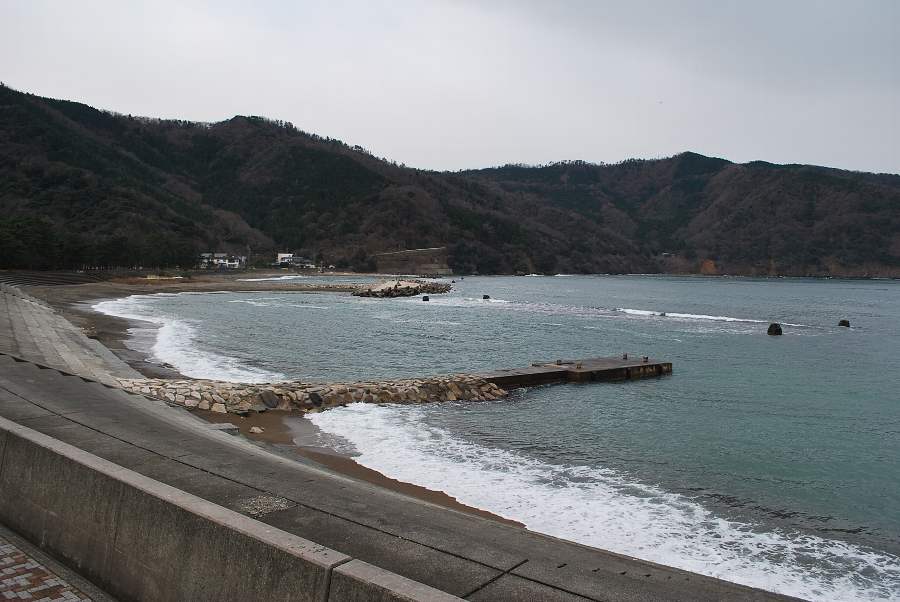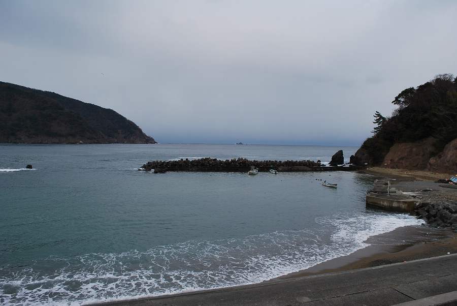 食見海岸は、1mのうねりがあり、防波堤を濡らしています。また、沖合いの千島には大きな波が被っているのが確認出来ました。