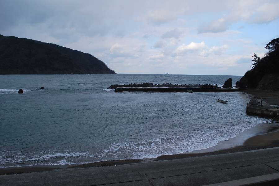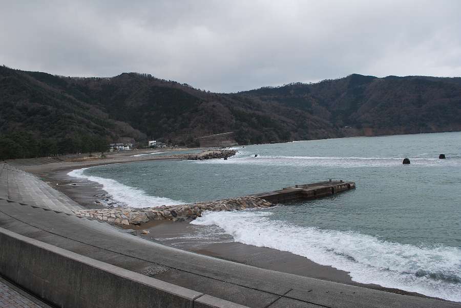 食見海岸は、2mの波が立っており、時おり防波堤に高い波が打ち付けています。