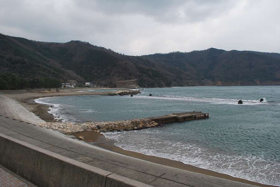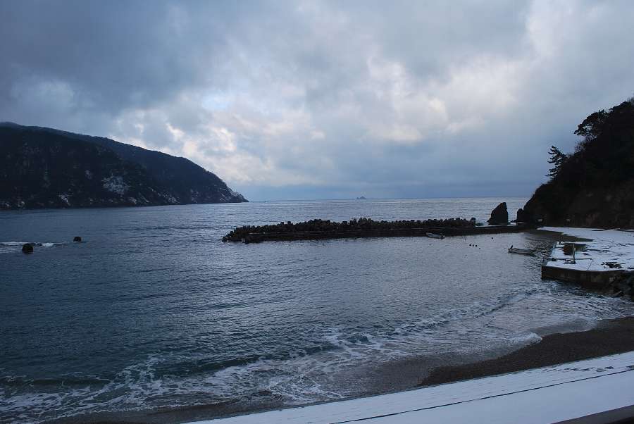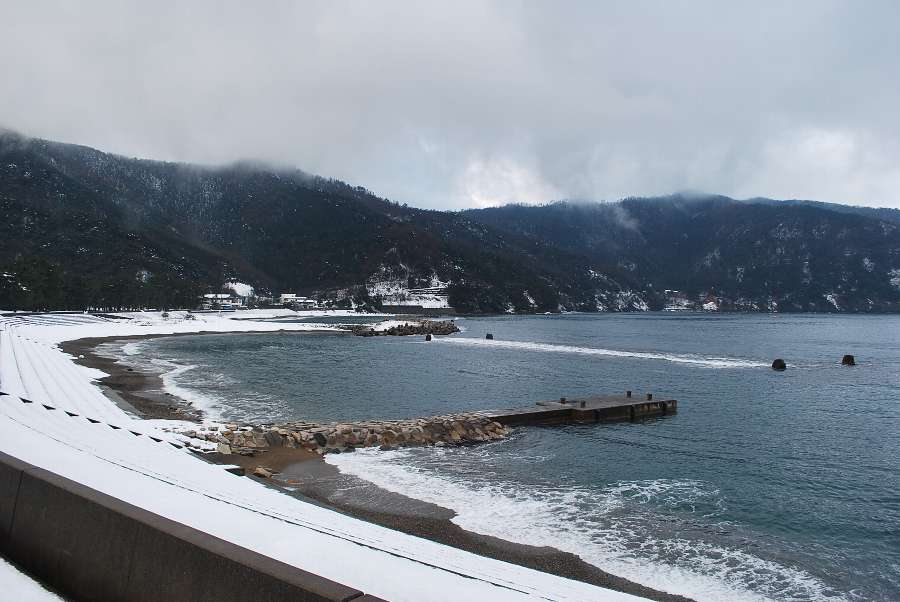 食見海岸は、0.5mの波があり、地面には6㎝の雪が残っています。