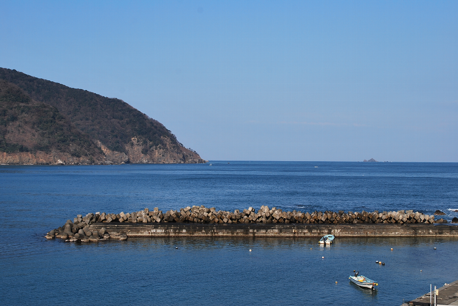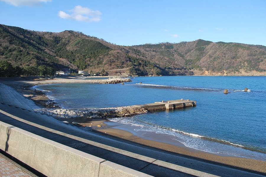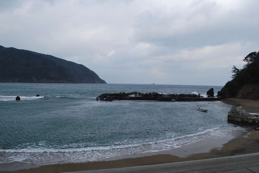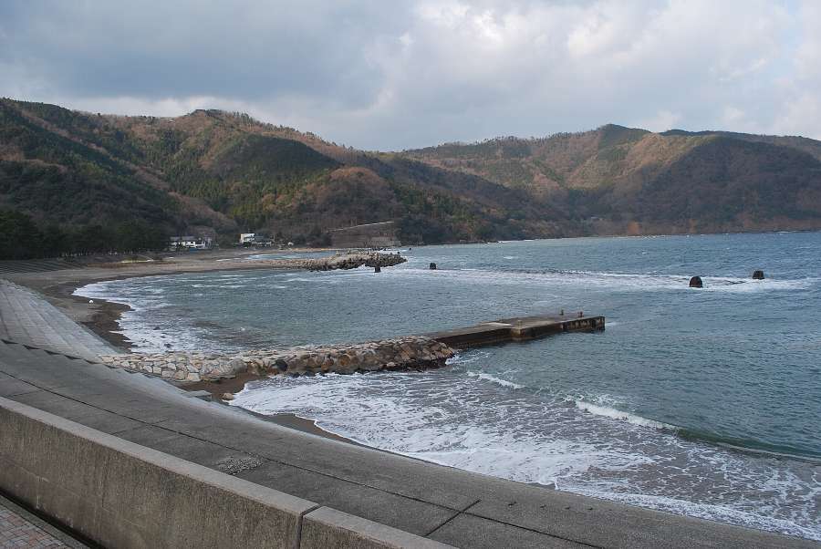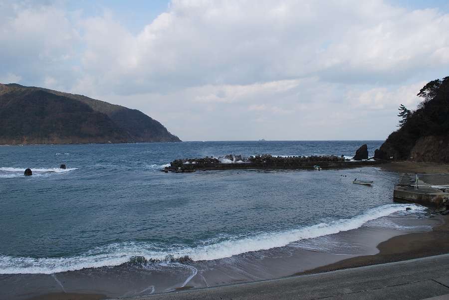 食見海岸は波が1mもあり、防波堤付近や潜堤に白波が立っています。