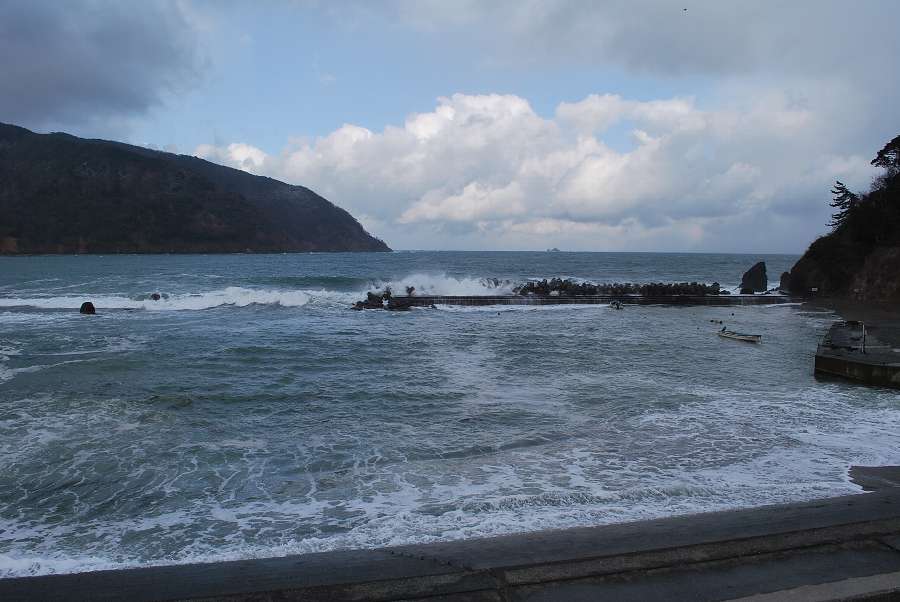 食見海岸は北海道にある低気圧の影響で2mほどの波があり、頻繁に波が防波堤を越えています。