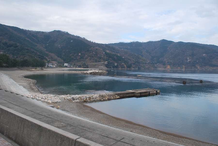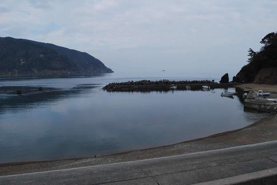 食見海岸は、波がほとんどない穏やかな海況で対岸の黒崎半島の山桜が咲き始めました。