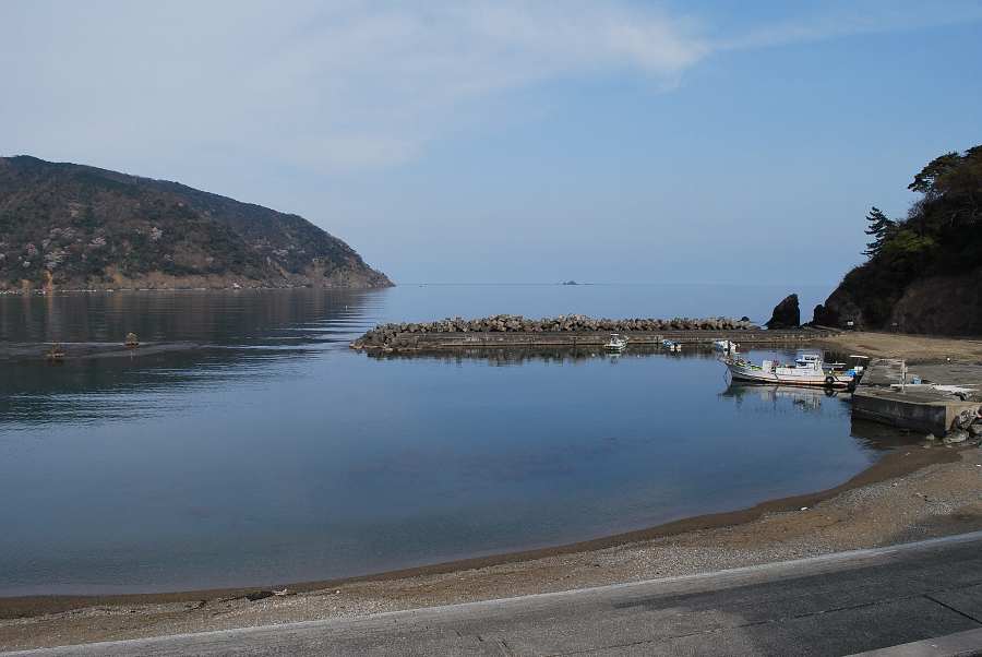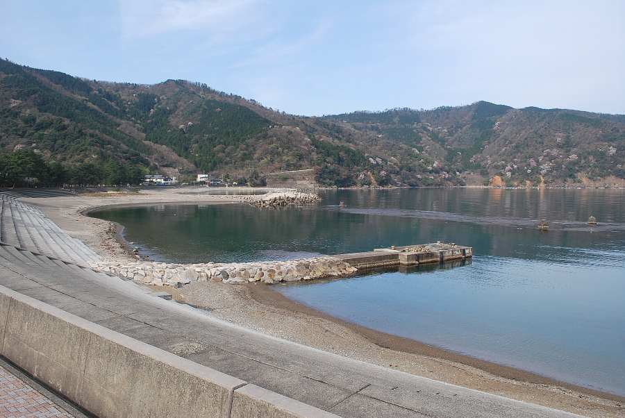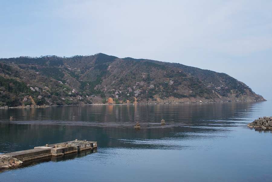 対岸の黒崎半島の山桜が満開を迎えており、今が見ごろになっています。