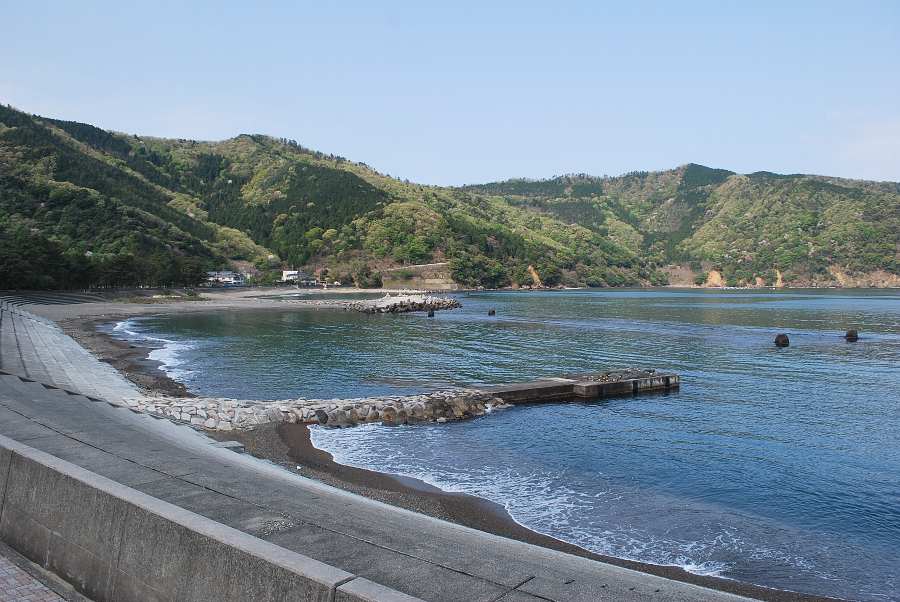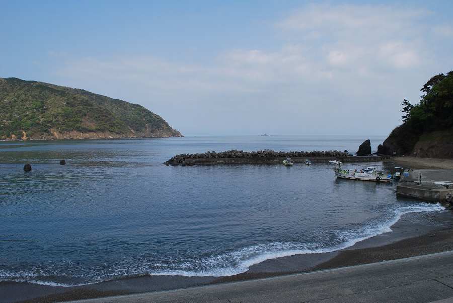 食見海岸は、0.5mの波があり、時おり防波堤の根元を濡らしています。