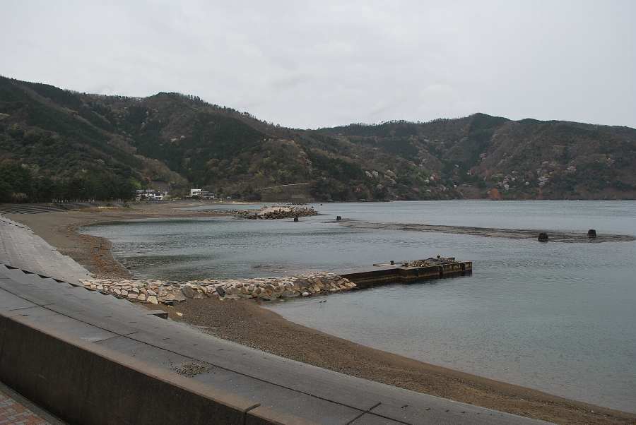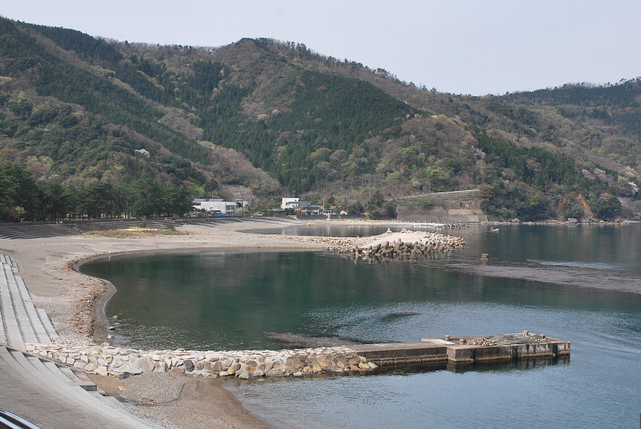 対岸の黒崎半島の山桜が満開を迎えており、今が見ごろになっています。