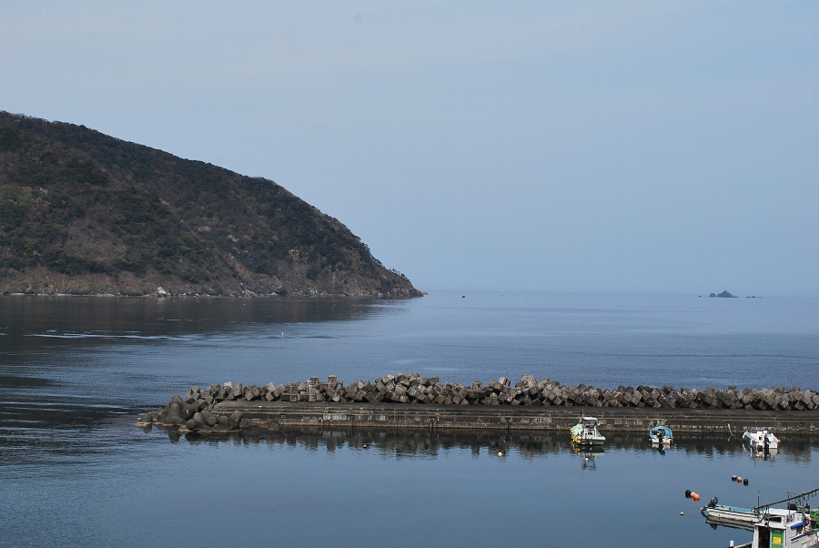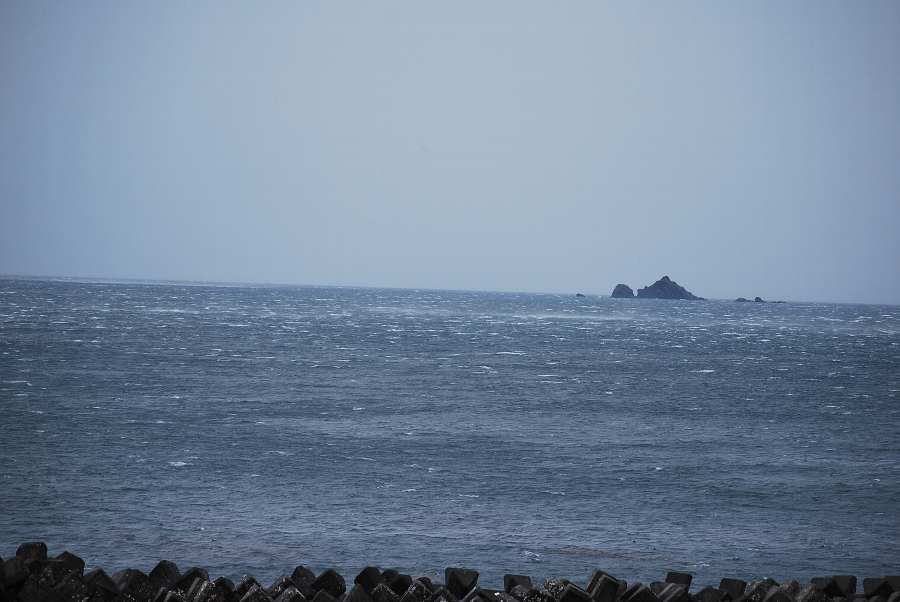 食見海岸は、1mの波があり、時おり防波堤の根元を濡らしています。