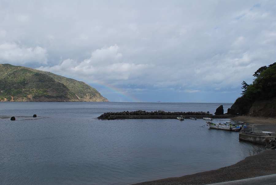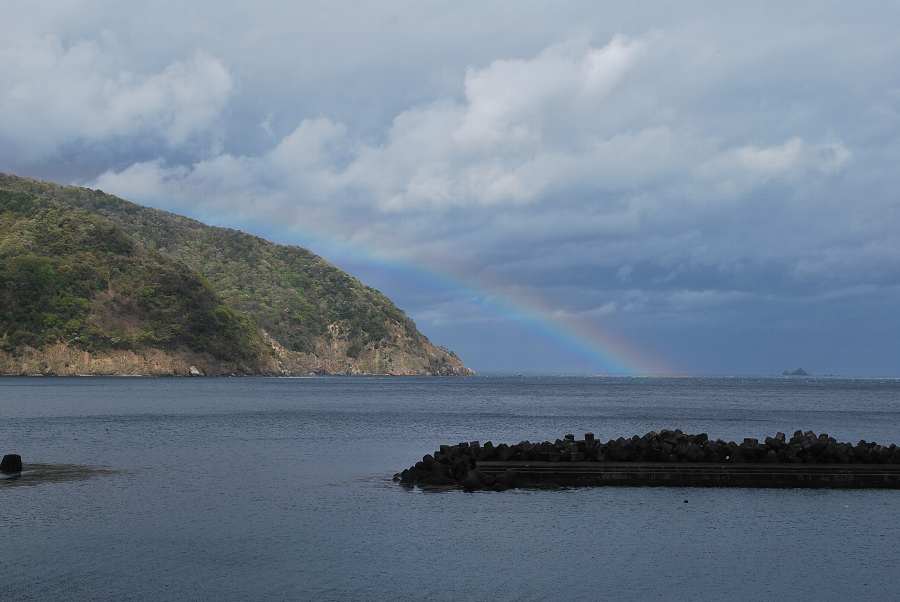 食見海岸は、波は打ち寄せてはいませんが、沖合いでは岸から沖合いにかけて強烈な波浪が確認できます。またわずかな晴れ間で虹が出ていました。