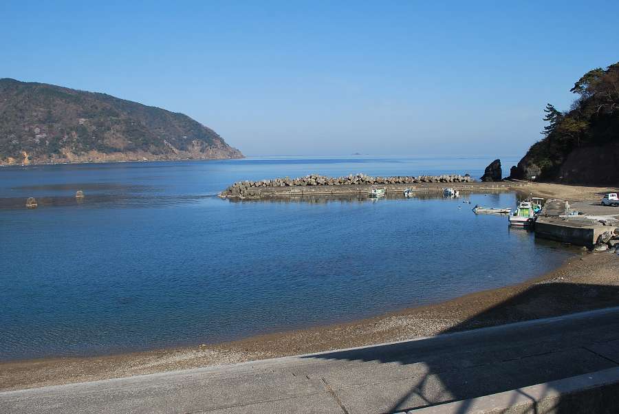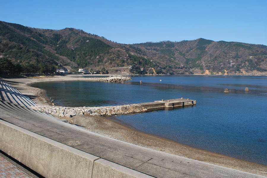 食見海岸は、波がほとんどない穏やかな海況で対岸の黒崎半島の山桜が咲き始めました。