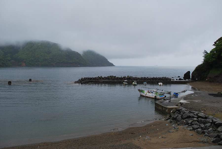 食見海岸は、凪いでいて水面が鏡のようになってます。ボートで釣りをしている姿も見られました。