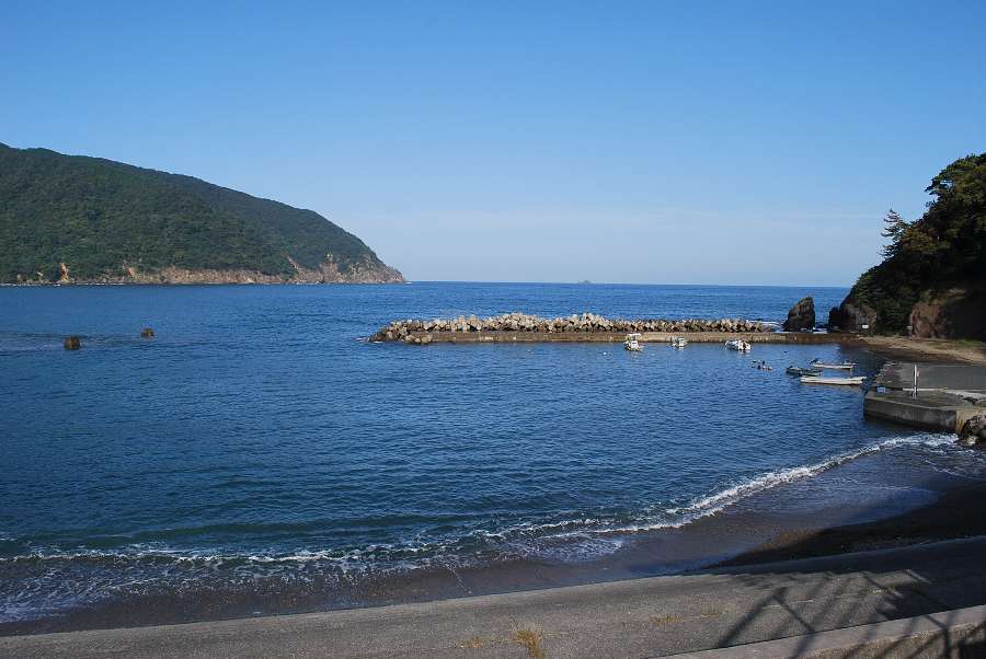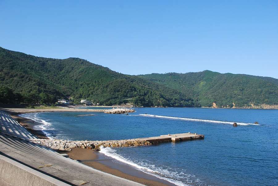 食見海岸は、1.5mの波があり、時おり防波堤が被るくらいの波しぶきがあります。