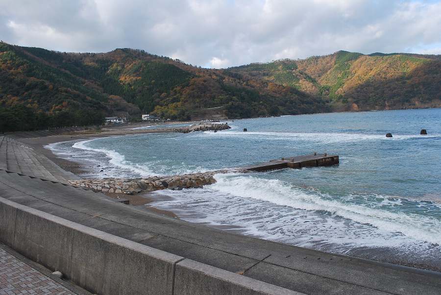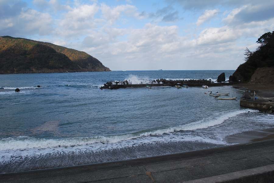 食見海岸は最大3mの波があり、時おり防波堤にかぶっています。