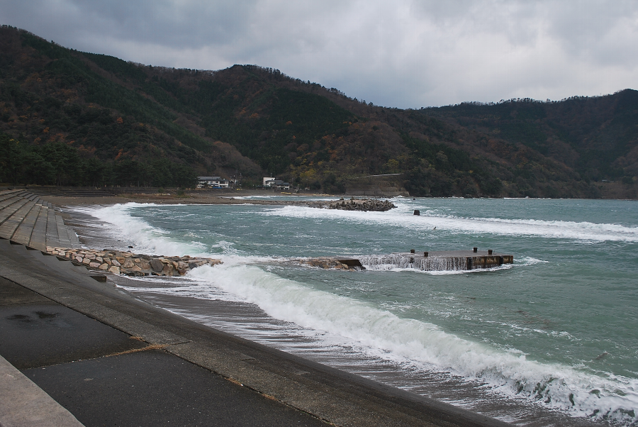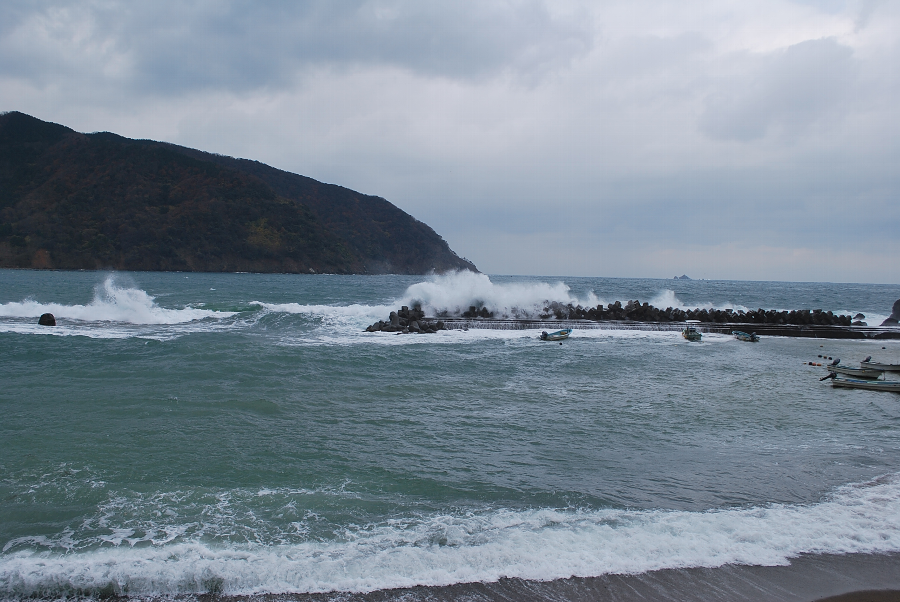 食見海岸は、消波ブロックを越える2~2.5mの波が打ち寄せていてます。