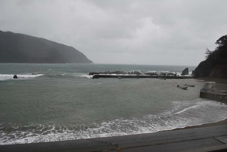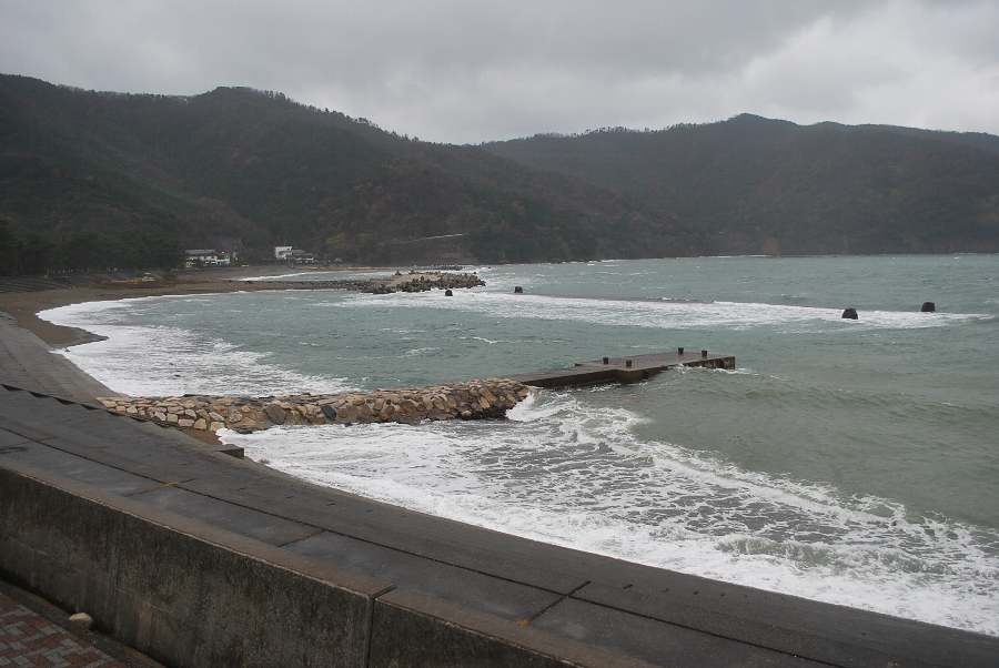 2016年12月14日9時現在は雨で、強い北風が吹いています。 食見海岸は、消波ブロックを越える2.5~3mの波が打ち寄せていてます。 海水の透明度は低く、波の影響で深緑色に濁っています。
