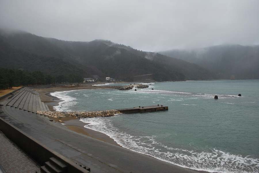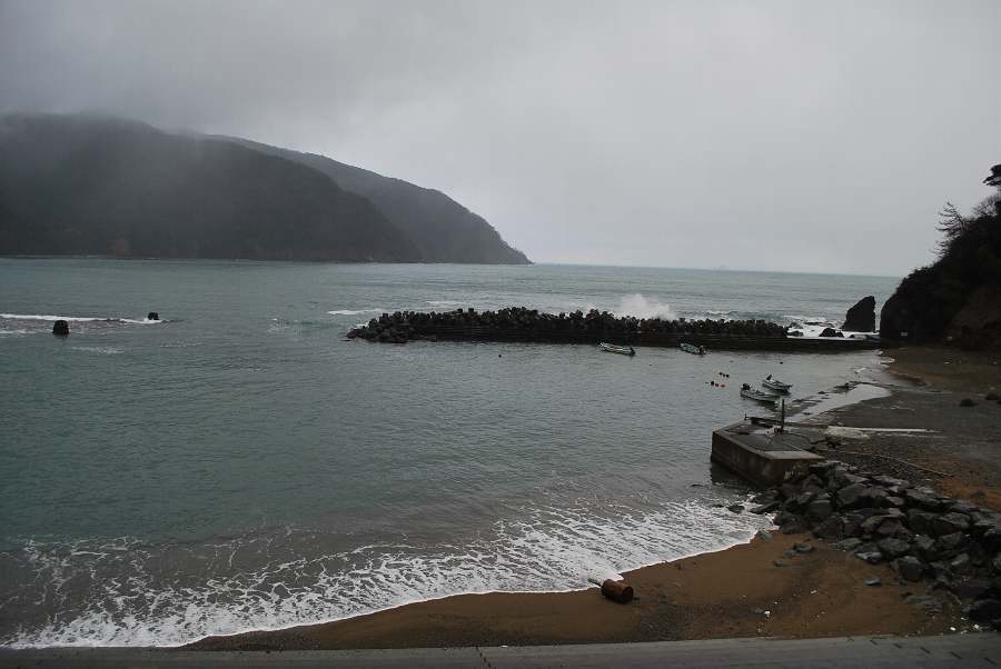 食見海岸は、2mの波があり、時おり防波堤に波が被っていました。