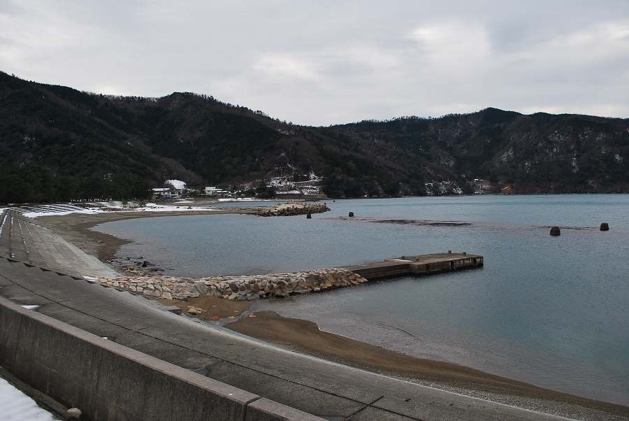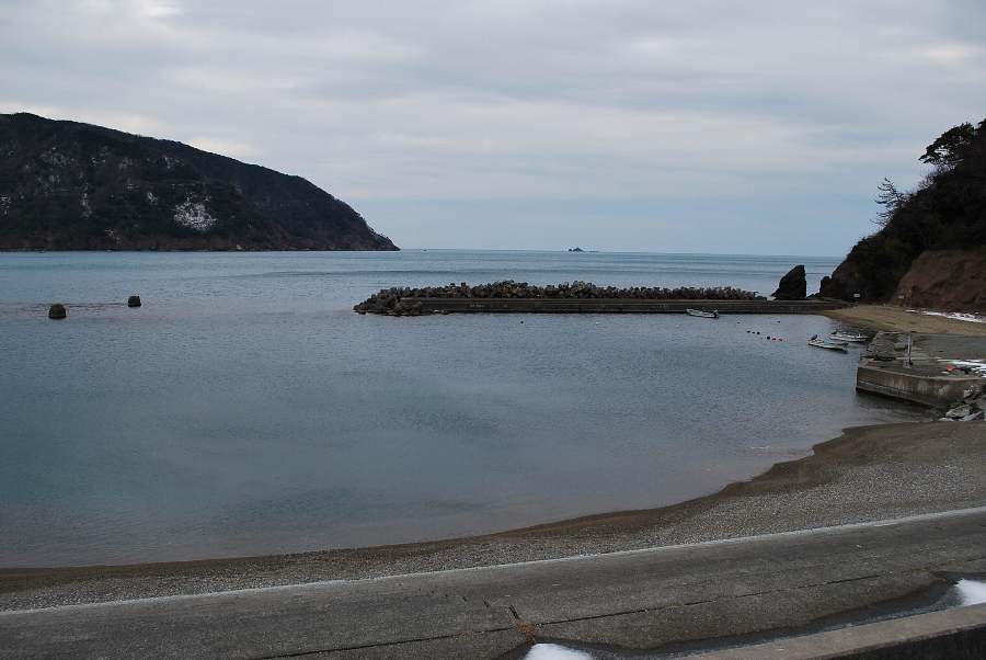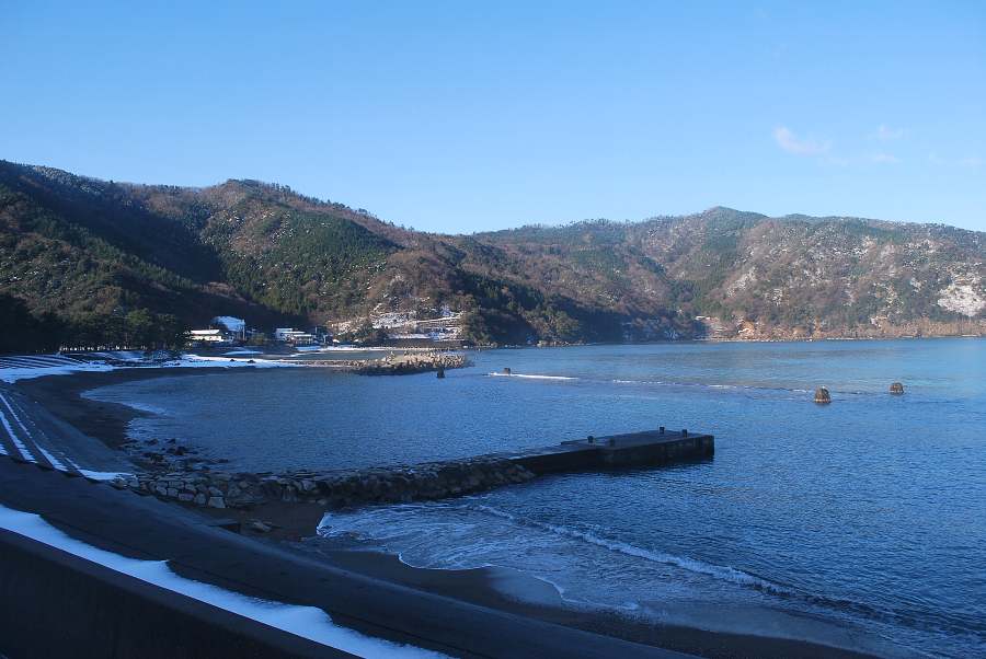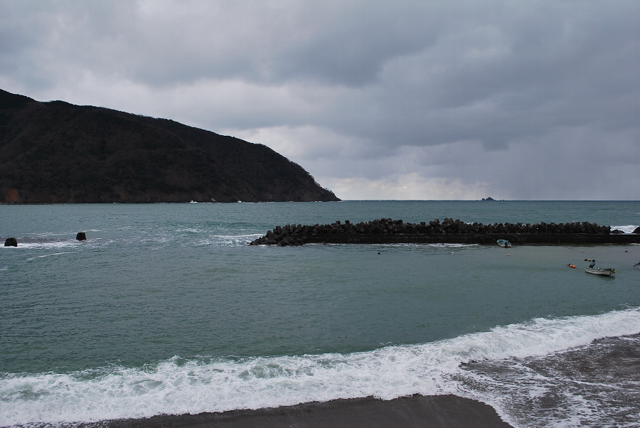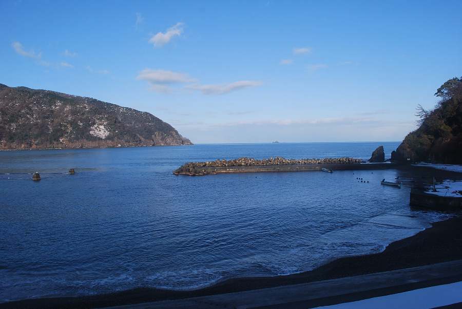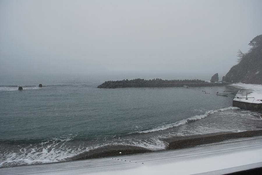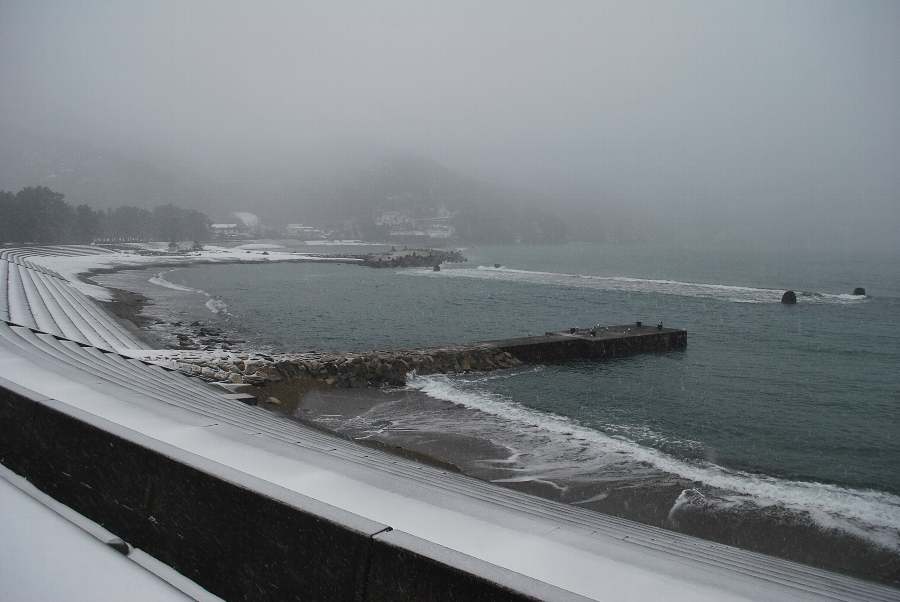 食見海岸は、2mの波があり、対岸の黒崎半島も雪景色になっています。