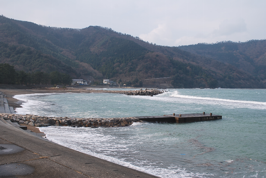 食見海岸は、最大3mの波があり、時おり防波堤を超えることがあります。