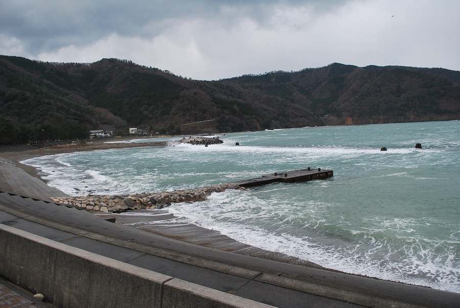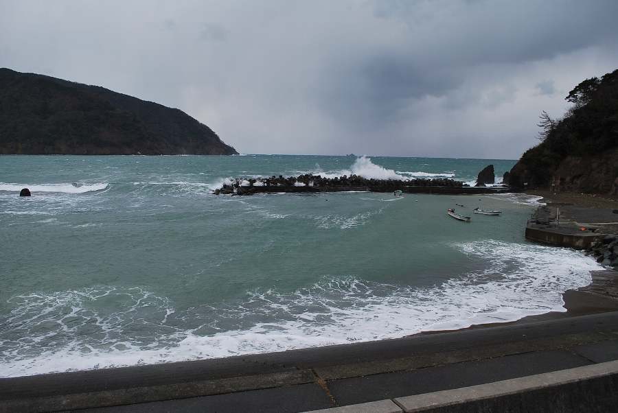 食見海岸は3mの波があり、波が防波堤を超えて打ち寄せています。