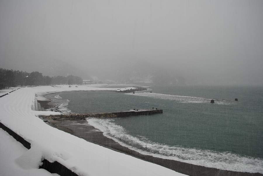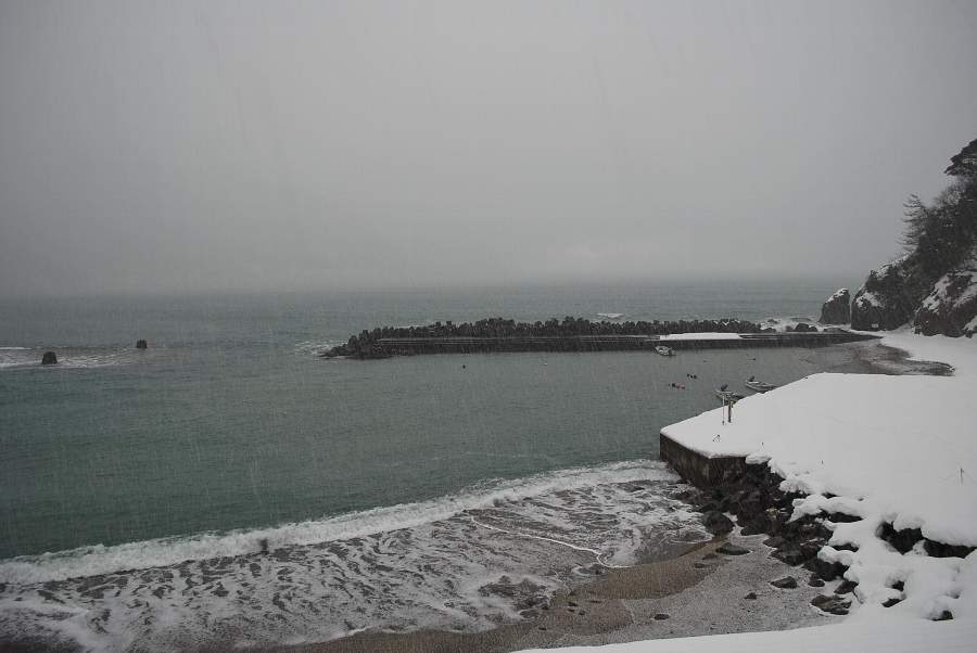 食見海岸は2.5mの波があり、ときおり防波堤に大波が被ります。