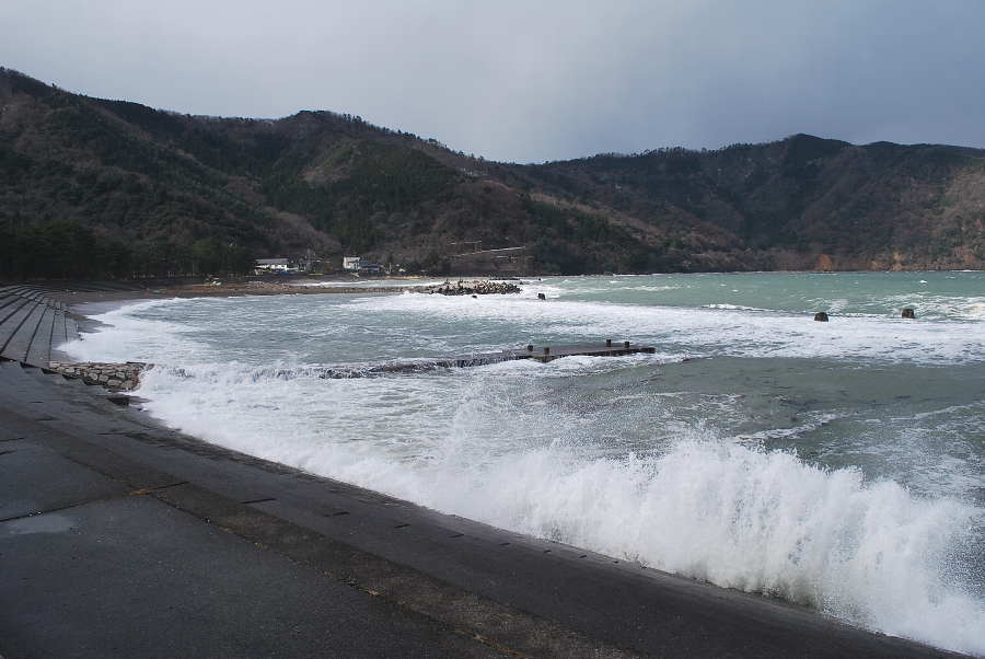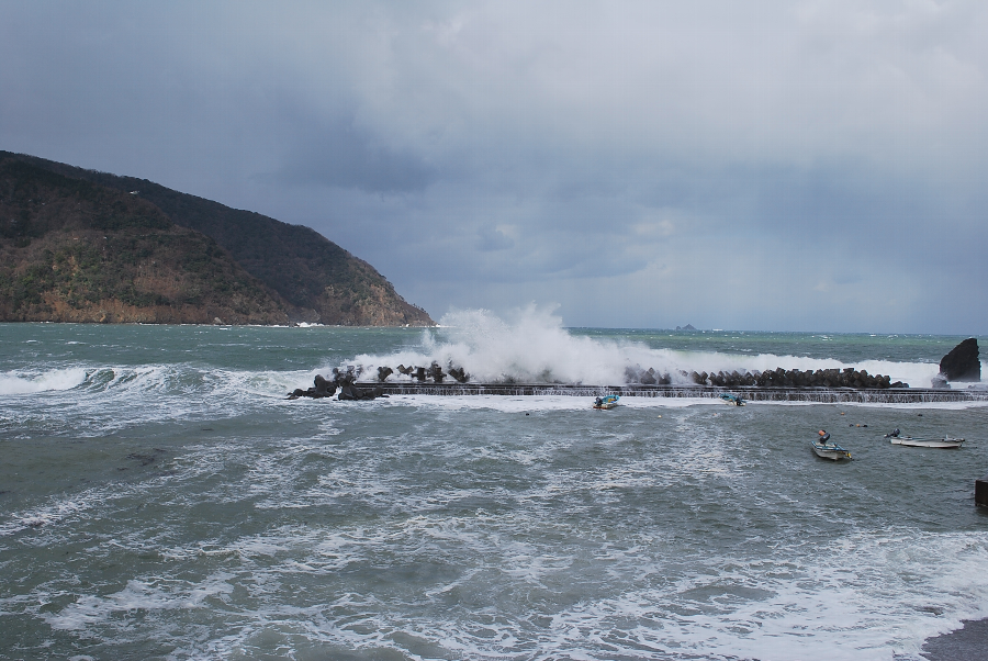 食見海岸は2mの波があり、時々防波堤に波が被ります。