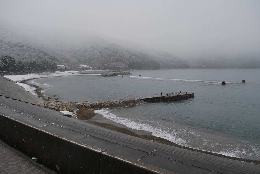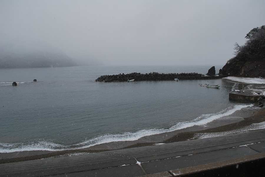 食見海岸は0.5mの波があり、陸地や対岸の黒崎半島が雪景色になっています。