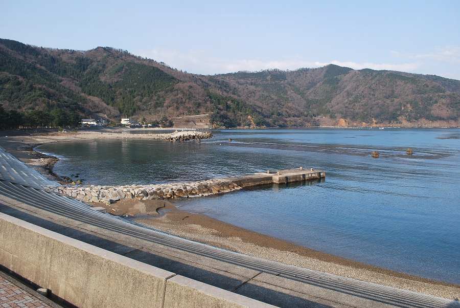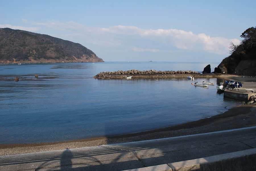 海水の透明度は高く、港内の海底の岩や海藻が見えています。