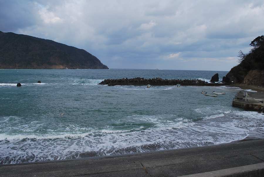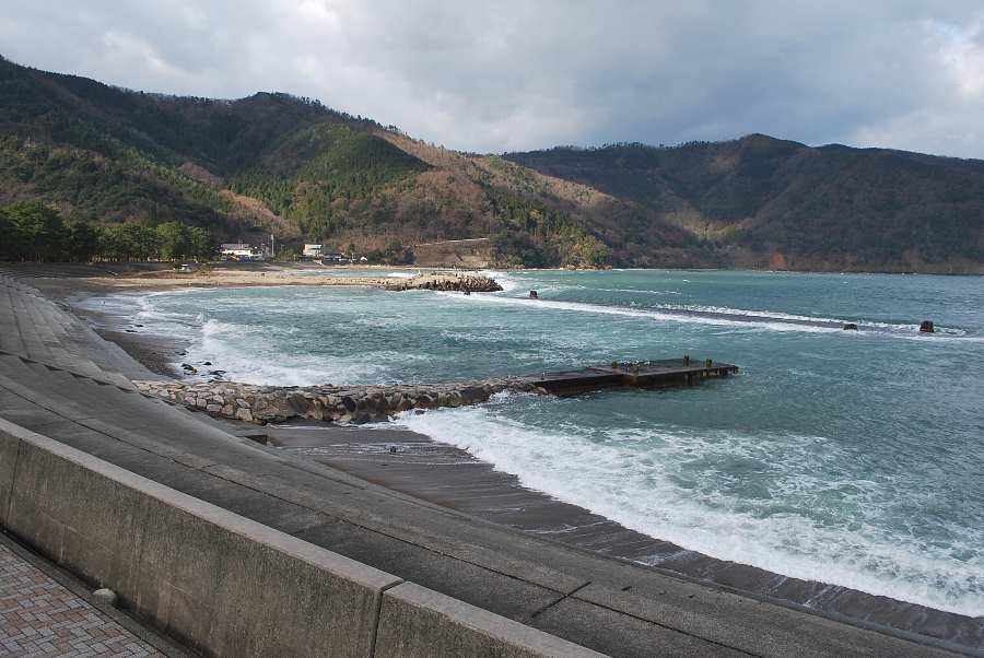 食見海岸は0.5mの波があり、陸地や対岸の黒崎半島が雪景色になっています。
