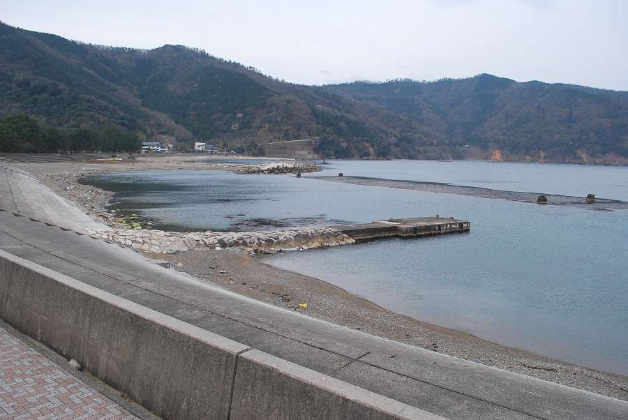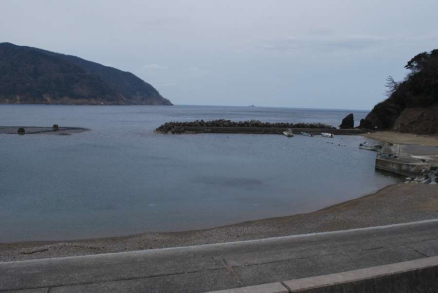 海水の透明度は高く、さざ波で見えにくいですが港内の海底の岩や海藻が見えています。