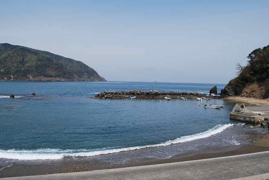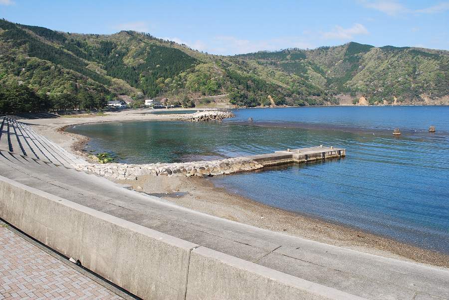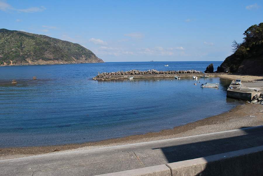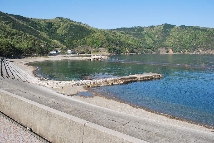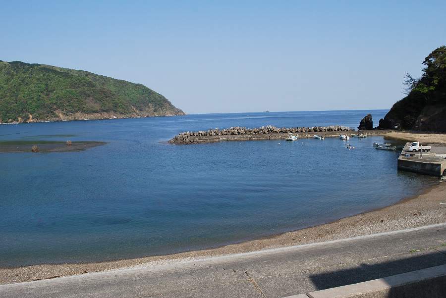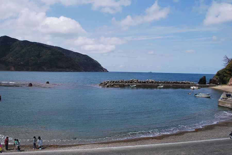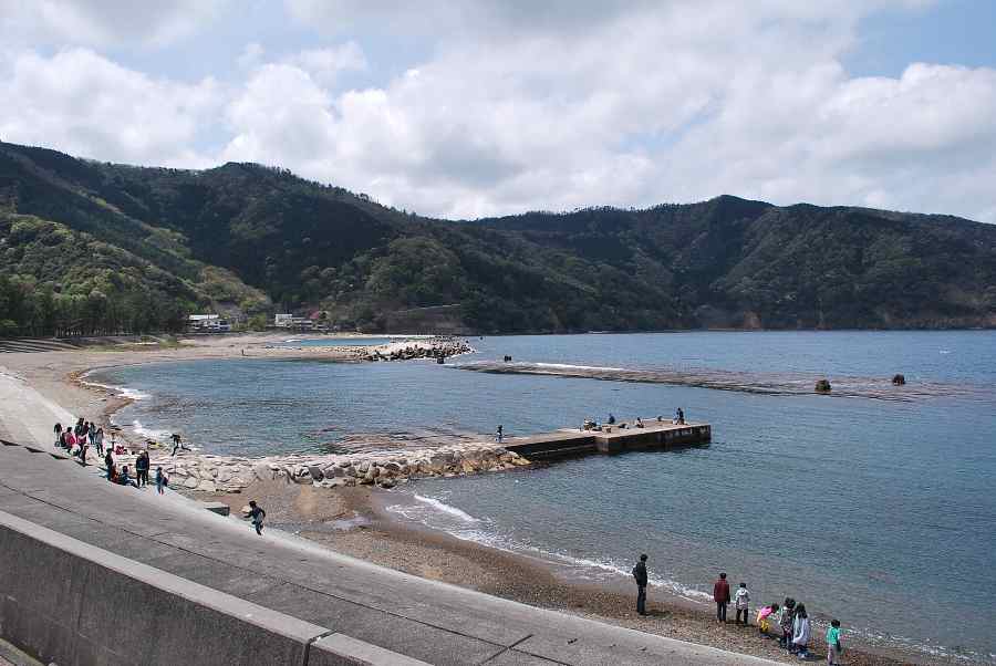 食見海岸は波もなく、穏やかな海況で浜歩きに最適です。