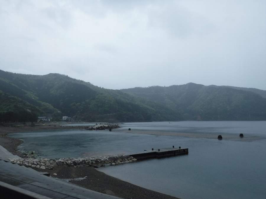 食見海岸は波はありませんが、南風で岸から沖合いにかけて波が発生しています。
