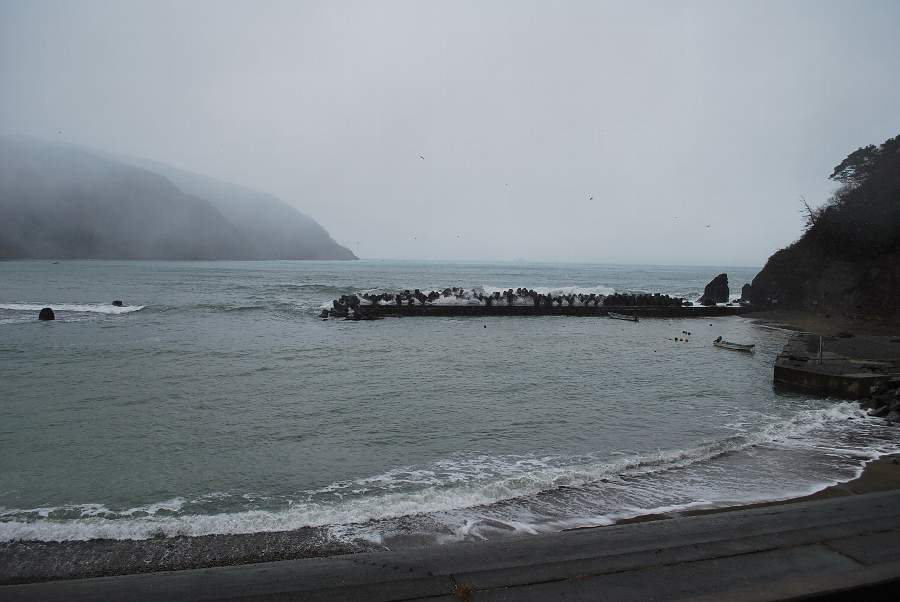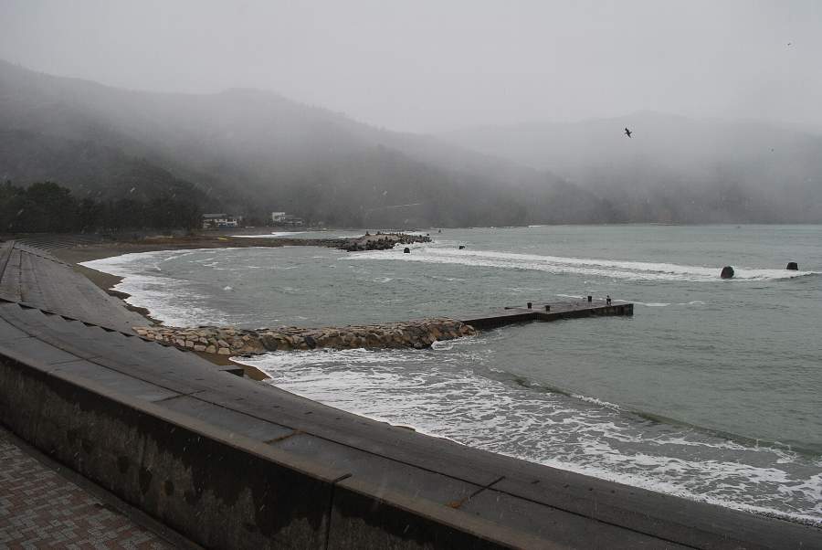 食見海岸は約2.5mの波があり、防波堤に波が被っています。