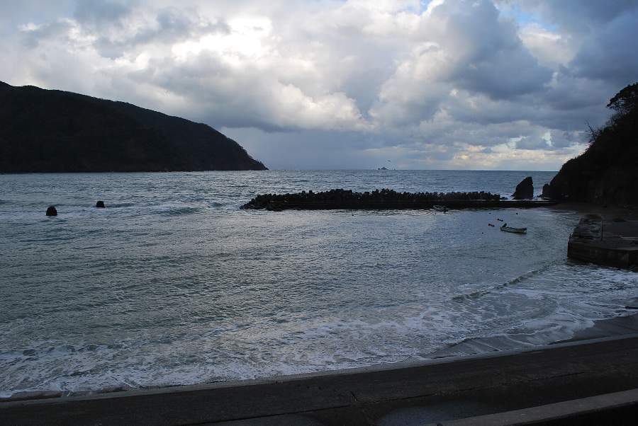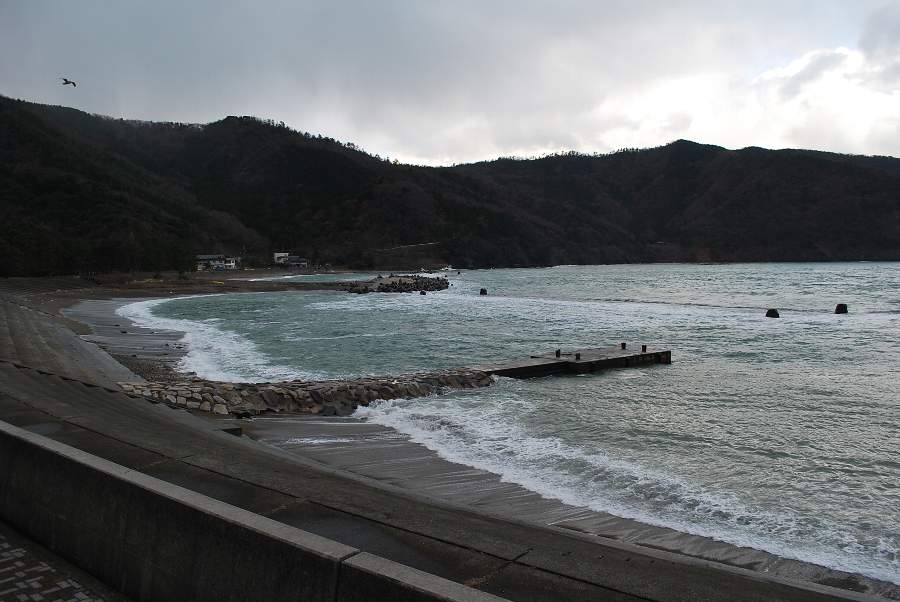 2017年12月14日9時現在は、雨で北風が吹いています。 食見海岸は約3mの波があり、時々防波堤に大波が被ります。 海水の透明度は波の影響で濁り、海中の様子が見えなくなっています。