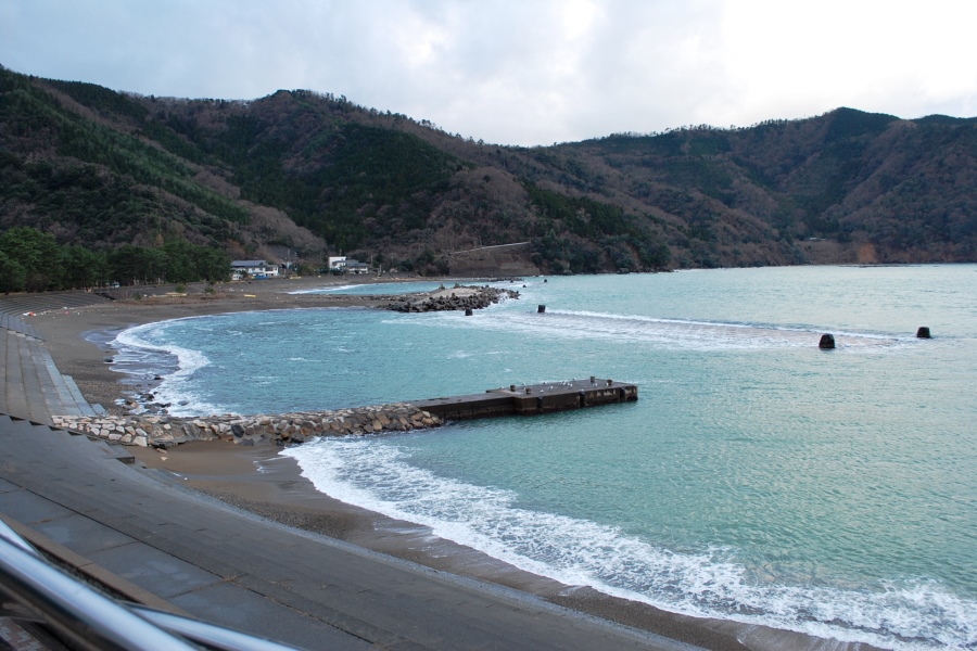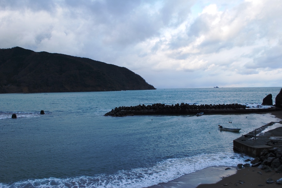 食見海岸は約2mの波があり、防波堤に波がひんぱんに被ります。