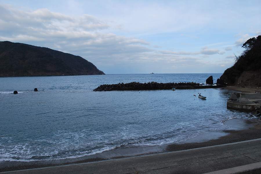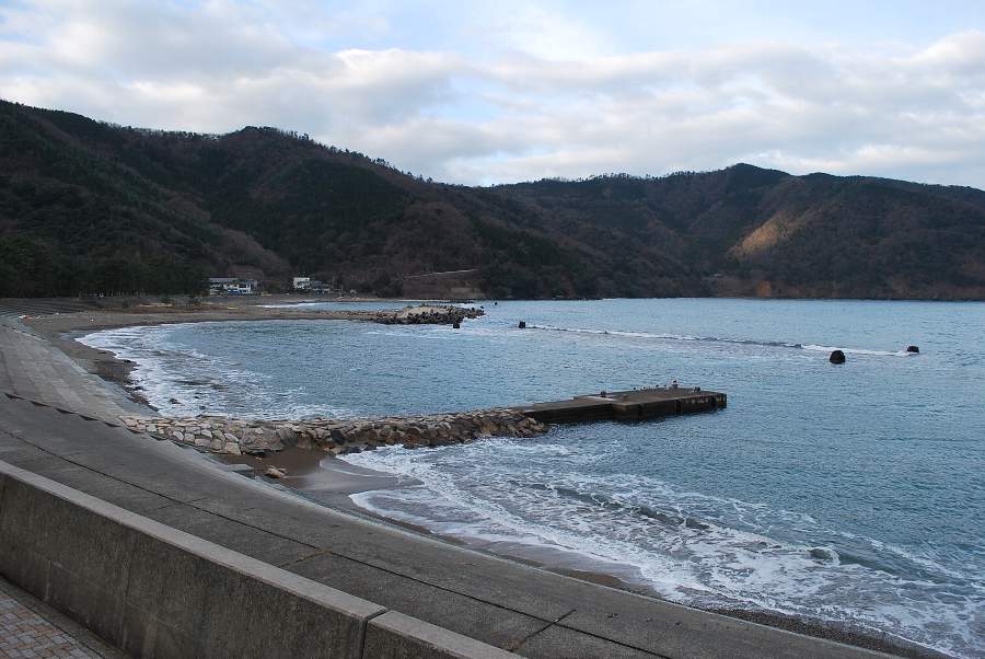 食見海岸は約1.5mの波があり、時々防波堤に波が被ります。